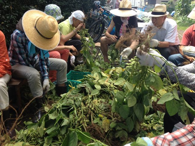 (みんなで輪になって、枝豆のサヤ取り)