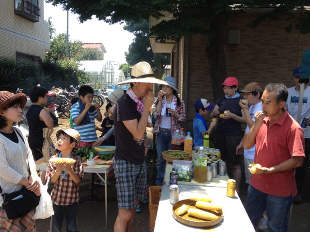 当日は、枝豆やとうもろこしといった作物の収穫補助を行い、それを農園から買い取らせてもらい、その場で、塩茹でしてゆでしたものを、みんなで囲って食べました。