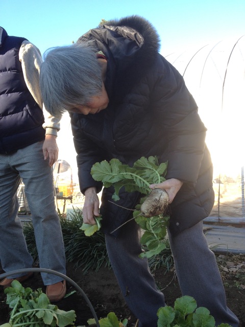 西東京農地保全協議会の畑を「おとなりさん。小金井公園」の方々が訪れ、ほうれん草、カブ、大根を収穫し、今回はとれたてのほうれん草をおひたしにして、みんなでいただきました!