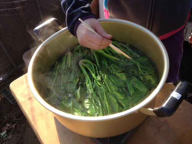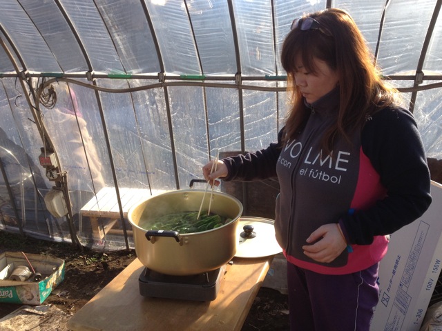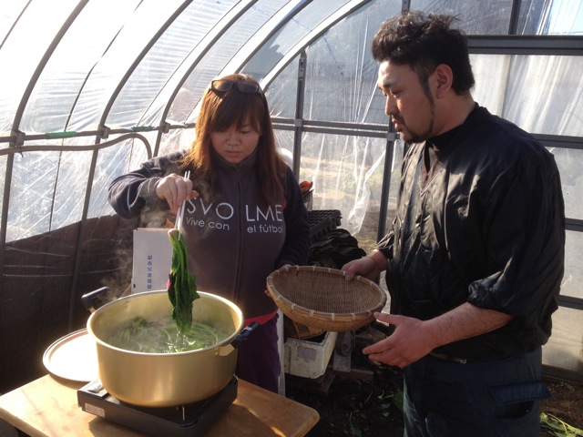 収穫したほうれん草を、中村農園の若奥さまがその場で調理します。